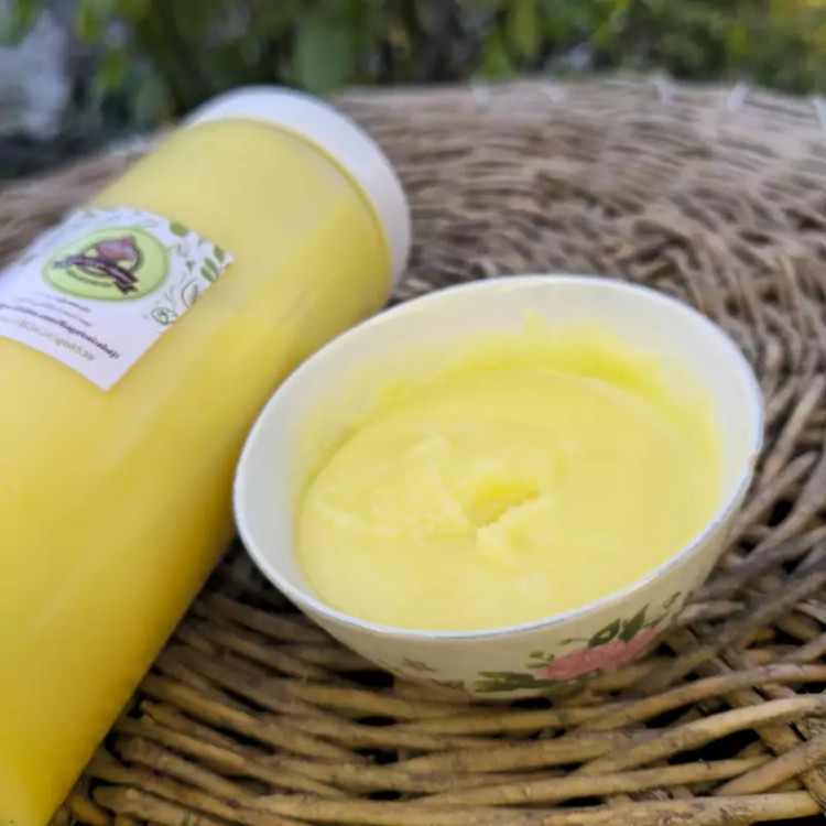روغن گاوی طبیعی – خالص و بدون نگهدارنده ✅ روغن گاوی طبیعی یکی از سالمترین و اصیلترین روغنهای حیوانی است که از کره گاوی تهیه میشود. ✅ این روغن، برخلاف بسیاری از روغنهای صنعتی که حاوی افزودنیها و نگهدارندههای شیمیایی هستند، بهطور کامل از مواد طبیعی به دست میآید و هیچگونه مواد شیمیایی یا نگهدارنده در تولید آن به کار نمیرود. ✅روغن گاوی طبیعی نه تنها طعمی خوشمزه و منحصر به فرد دارد، بلکه از نظر تغذیهای نیز بسیار مفید است. روش تولید روغن گاوی طبیعی روغن گاوی از کره گاوی به دست میآید که ابتدا از شیر تازه گاو تهیه میشود. کره گاوی پس از حرارت دادن ملایم و فرآیندهایی خاص، به روغن تبدیل میشود. این روش سنتی تولید باعث میشود که روغن بهطور کامل از چربیهای طبیعی شیر گاو بدست آید و هیچگونه مواد شیمیایی یا افزودنی به آن افزوده نشود. 👈به همین دلیل، روغن گاوی طبیعی در مقایسه با بسیاری از روغنهای صنعتی، طعمی غنی، خالص و سالم دارد. مزایای روغن گاوی طبیعی 1. بدون افزودنی و نگهدارنده: روغن گاوی طبیعی هیچگونه مواد شیمیایی یا نگهدارنده ندارد. این ویژگی باعث میشود که طعم آن کاملاً طبیعی باشد و مصرف آن برای سلامتی بهتر از روغنهای تصفیهشده صنعتی باشد. این روغن بهطور 100% طبیعی و خالص است. 2. سرشار از چربیهای سالم: روغن گاوی طبیعی حاوی چربیهای اشباعشده سالم است که به بدن انرژی لازم را میدهند. این چربیها میتوانند به حفظ سلامت قلب و عروق کمک کنند و به تنظیم سطح کلسترول بد خون (LDL) کمک نمایند. 3. منبع غنی از ویتامینها: روغن گاوی سرشار از ویتامینهای A، D، E و K است که برای تقویت سیستم ایمنی، سلامت چشمها، پوست و مو بسیار مفید هستند. این ویتامینها در روغن گاوی بهصورت طبیعی وجود دارند و به جذب بهتر مواد مغذی در بدن کمک میکنند. 4. مناسب برای پخت و پز: روغن گاوی طبیعی به دلیل دارا بودن دمای ذوب بالاتر نسبت به بسیاری از روغنها، برای پخت و پز بسیار مناسب است. از آن میتوان برای سرخ کردن، پختن غذاهای گوشتی، تهیه انواع خوراکها و حتی در تهیه کیک و نان استفاده کرد. همچنین، این روغن برای طعمدهی به غذاها بسیار مناسب است و به آنها طعمی غنی و دلپذیر میدهد. 5. حفظ سلامت پوست و مو: روغن گاوی طبیعی به دلیل داشتن ویتامینهای مختلف، خواص زیادی برای پوست و مو دارد. استفاده از این روغن میتواند به نرمی و لطافت پوست کمک کرده و برای تقویت موها نیز مفید باشد. نکات استفاده از روغن گاوی طبیعی - برای نگهداری از روغن گاوی طبیعی بهتر است آن را در دمای اتاق و در یک مکان خشک و خنک نگه دارید تا طراوت و کیفیت آن حفظ شود. - این روغن برای افرادی که به دنبال محصولات طبیعی و سالم هستند، گزینهای ایدهآل است.